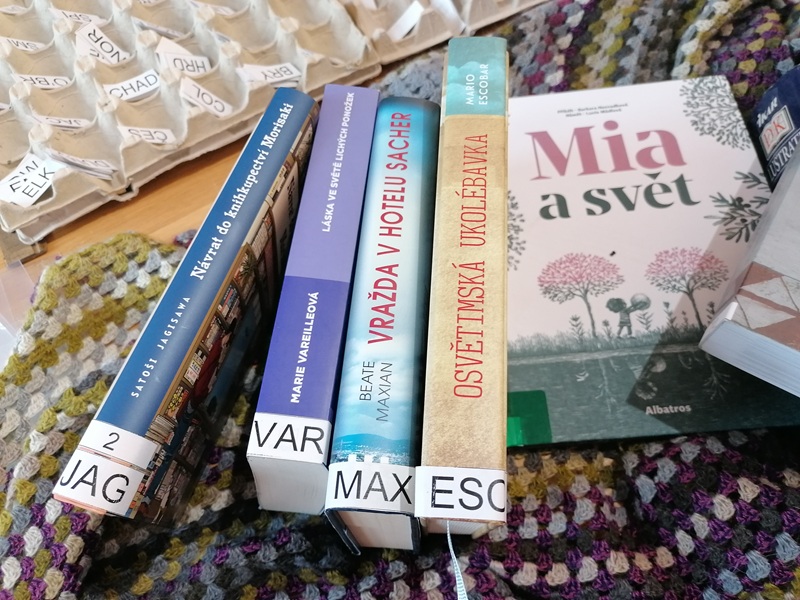 Protože se mnozí (někteří opakovaně) ptají, co že to je v těch papírových platech na vajíčka, zde je písemná odpověď. Na hřbetu každé knihy jsou počáteční písmena jména autora - u knih pro dospělé tři, u dětských knih jedno - a případně číselné označení svazku řady: takže nový Robert Bryndza má BRY 9. Někde ta písmenková označení musejí bydlet a ukázalo se, že plata na vajíčka jsou pro tento účel docela šikovná :-)