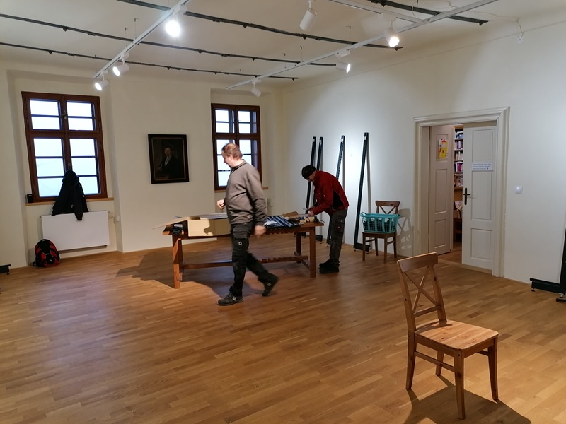 Knihovnice si vybírá dovolenou a truhlář pan Novotný skládá regály do oddělení pro dospělé.